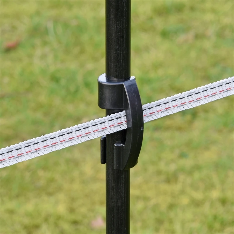 Dank der Klemmisolatoren und dem am Zaunpfahl integrierten Kopf- und Bodenisolator ist dieser Zaun unbegrenzt erweiterbar. Sie können mit den Leitermaterialien stufenlos weitere Reihen in benötigter Höhe anbringen. Der Isolator wird einfach in der gewünschten Höhe an den Pfahl geklippt. Er sitzt rutschfest und sicher.