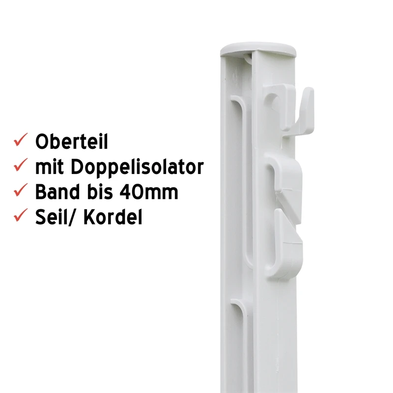 Die Länge der Kunststoffpfähle, die Anordnung und die Art der Ösen sind so gewählt, dass fast alle Tierarten gehütet werden können. In der Praxis werden diese Kunststoffpfähle auch Pferdepfahl oder Ponypfahl genannt. Sehr gute Qualität ist bei diesem Pfahl von VOSS.farming selbstverständlich. Die Weidezaunpfähle bestehen aus hochwertigen Kunststoffen und sind durch Verstrebungen und Glasfasern sehr stabil. Der praktische Doppeltritt erleichtert das Aufstellen und Ausrichten auf der Weide und im unebenen Gelände.