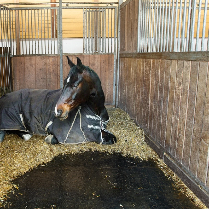 Mit der Belmondo Stallmatte Classic schaffen Sie Ihrem Pferd eine angenehme und trittsichere Box- und Liegefläche. Das Hufeisenprofil auf der Oberseite und das Rillenprofil auf der Unterseite sorgen für optimalen Komfort und Sicherheit. Jede Matte hat eine Abmessung von 100 x 100cm und eine Stärke von 18mm, wodurch sie problemlos mit Hoflader, Trecker usw. befahren werden kann.