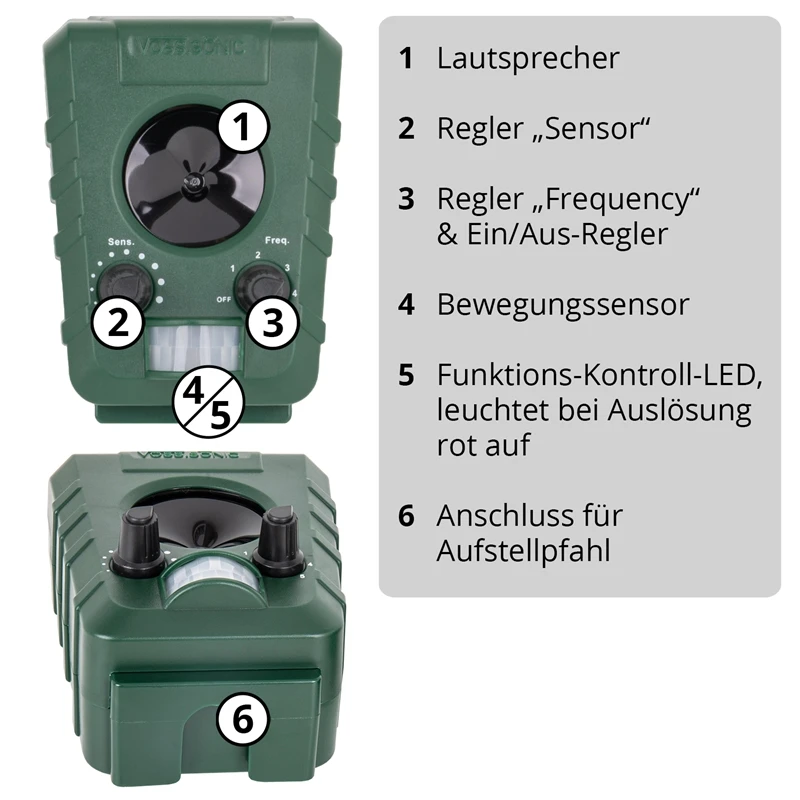 Sobald der Bewegungsmelder aktiviert wird, beginnt das Gerät eine Gruppe von Schallsignalen auszusenden, deren Frequenzen auf der jeweiligen Einstellung beruhen. Die Tiere können sich nur schwer an die ständig wechselnden Gruppen von Schall- und Ultraschall gewöhnen. So verlassen sie meistens das beschallte Gebiet und suchen sich ein neues Zuhause.