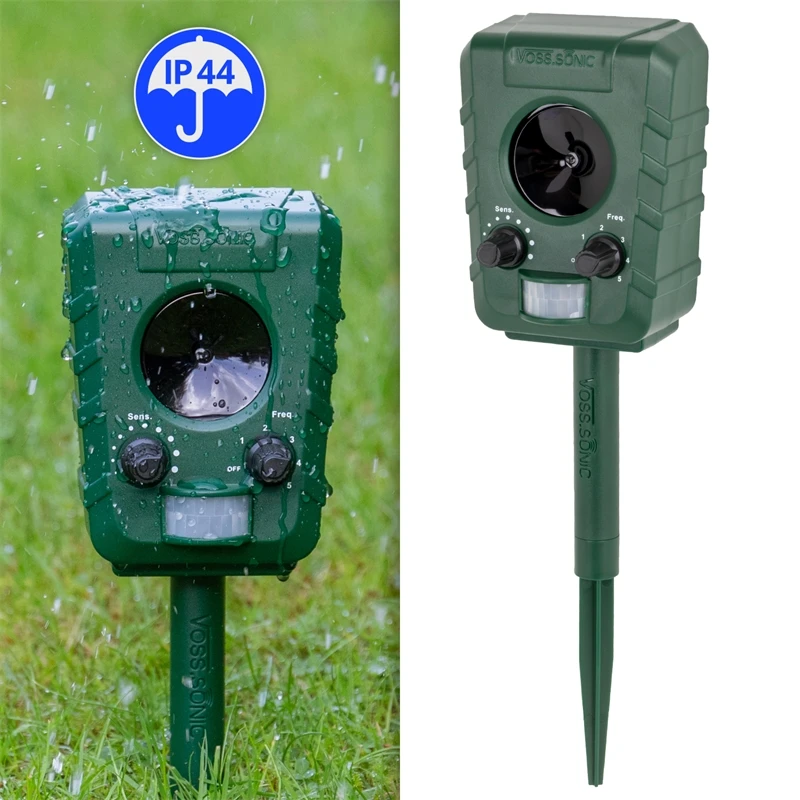 Platzieren Sie den VOSS.sonic 1200 genau dort, wo Sie die oben genannten Tiere vertreiben möchten. Verwenden Sie hierfür den mitgelieferten Aufstellpfahl und stecken Sie diesen mit dem Gerät ganz einfach in den Boden. Alternativ können Sie den VOSS.sonic 1200 auch mithilfe der Aufhängeöse an der Wand montieren.