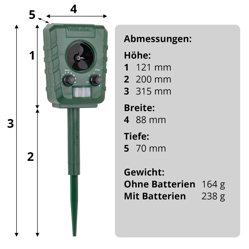 - 5 einstellbare Stufen – je nach Einstellung der Frequenz können unterschiedliche Tiere vertrieben werden