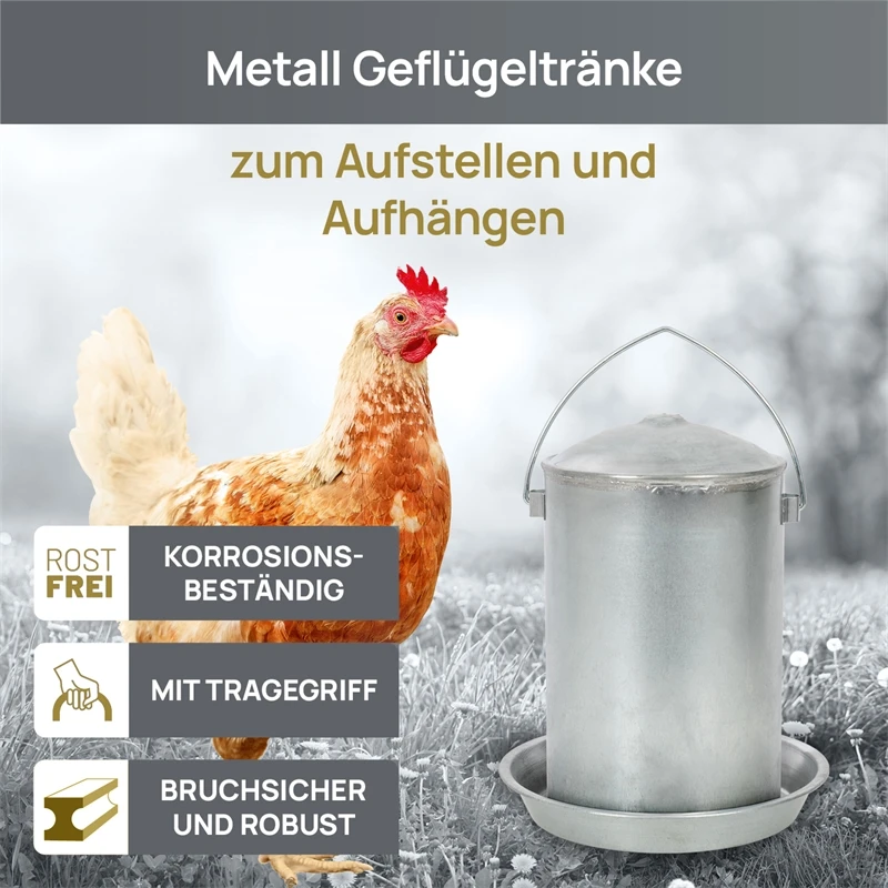 Sie ist korrosionsbeständig gegen Wasser, um eine lange Lebensdauer zu gewährleisten. Die Tränke verfügt über einen Griff an der Oberseite zum Aufhängen und ist durch ihre doppelwandige Konstruktion leicht zu befüllen.