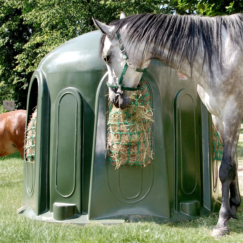 Die Futterstation mit integriertem Netz wurde speziell für Pferde entwickelt und bietet viele Vorteile gegenüber herkömmlichen Heuraufen. Mit fünf Fressöffnungen von je 35cm Breite können mehrere Pferde gleichzeitig fressen, was die Fütterungszeit verkürzt und den Stress im Stall reduziert.