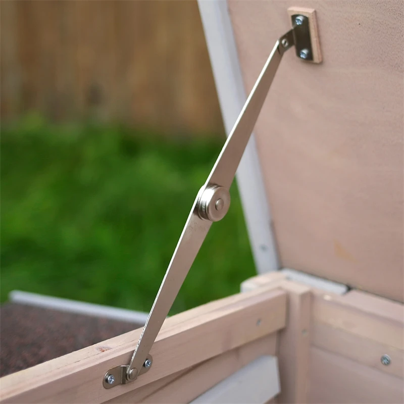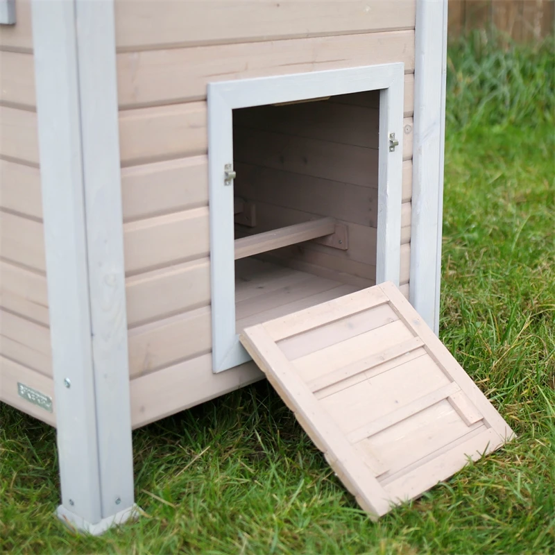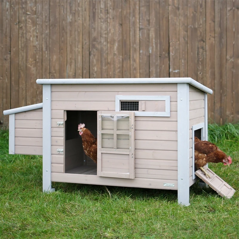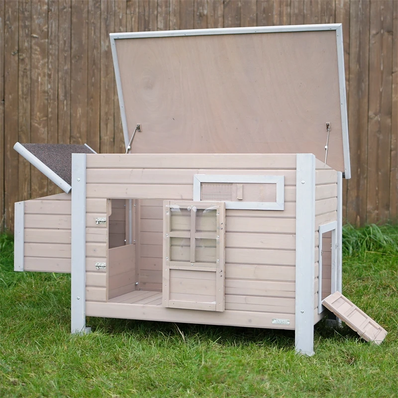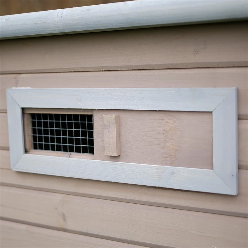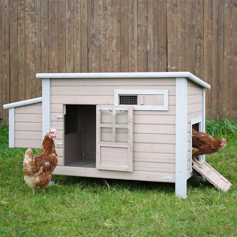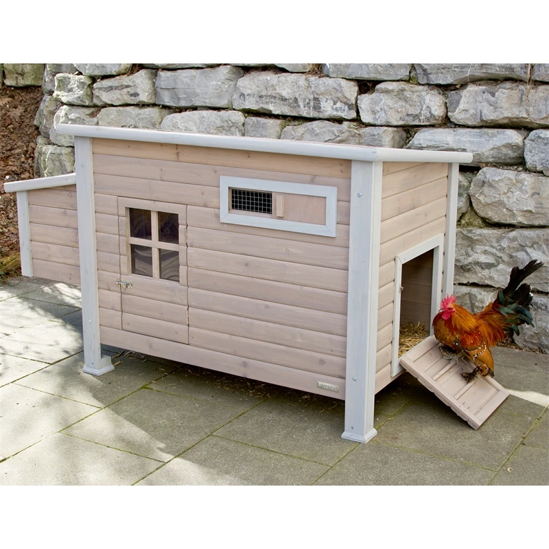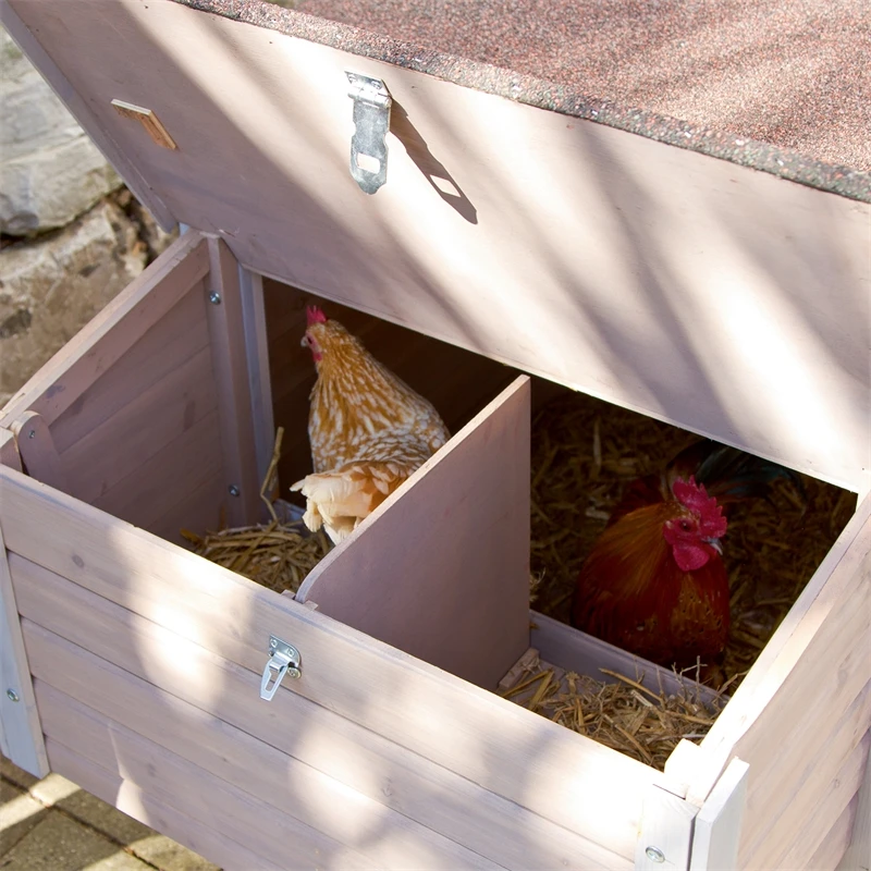 Die verlängerten Füße stellen sicher, dass der Stall ein paar Zentimeter über dem Boden steht und sorgen damit für eine bessere Bodendurchlüftung. Um die Luftzirkulation innerhalb des Stalls stets variabel halten und anpassen zu können, ist außerdem ein Schiebefenster integriert. Das Schiebefenster ist, wenn es geöffnet ist, zusätzlich durch ein Gitter gesichert. Das aufklappbare Bitumendach kann komplett geöffnet werden und ermöglicht eine leichte Reinigung des Stalles. Der zusätzlich erhöhte Anbau mit zwei Legenestern und Sitzstangen bietet Ihren Hennen einen gemütlichen Platz, um Eier legen zu können. Der Anbau besitzt ebenso ein aufklappbares Dach, wodurch Sie schnell und einfach an die Eier gelangen können. Für den Ein- und Ausstieg der Tiere kann ein Tor mit Rampe aufgeklappt werden sowie eine seitliche Tür.