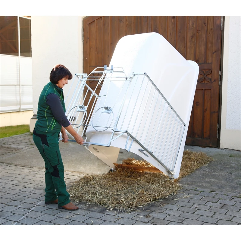 Der feuerverzinkte Zaun ist mit Vertikalstreben ausgestattet und kann mit der Hütte ineinader geklappt werden. Durch Vollgummireifen lässt sich das CalfHouse Master Plus einfach und ohne Hilfsmittel versetzen. Punkten kann das Kälberiglu auch durch eine zurücksetzbare Drehtür mit zwei Fressöffnungen und Flex-Schiene zur Montage von Zubehör.