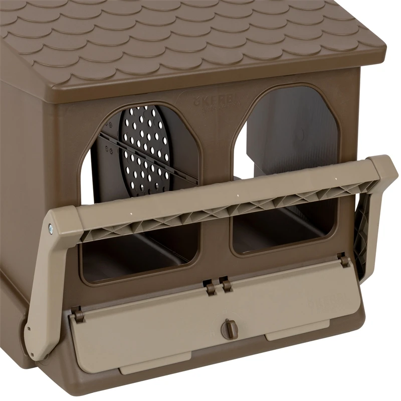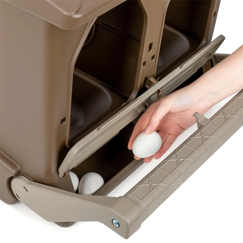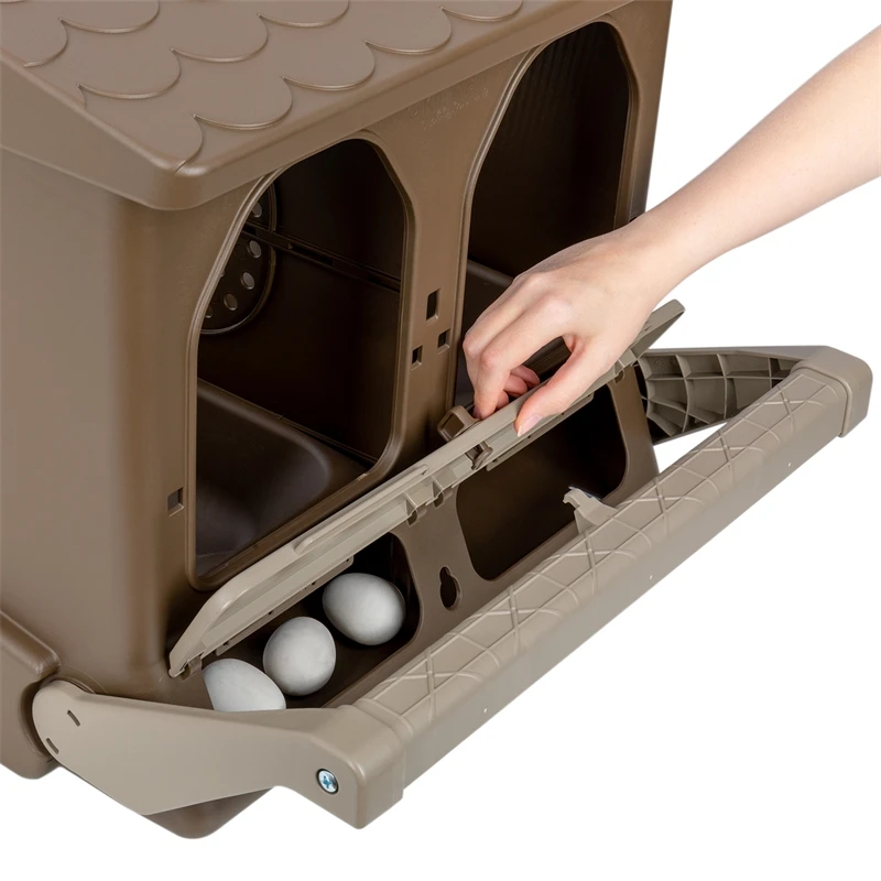 Das robuste Legenest mit 2 Abteilungen bietet für bis zu 6 Hühner ausreichend Platz und unterstützt eine komfortable Eiablage. Die Hühner nehmen die Nester in der Regel schnell an und nutzen diese sehr gerne. Die klappbare Sitzstange erleichtert den Einstieg in das Nest und kann zudem für das Versperren des Eingangsbereichs genutzt werden. Über den geneigten Boden rollen die Eier in die Auffangwanne. Über die Inspektionsklappe können diese dann entnommen werden.