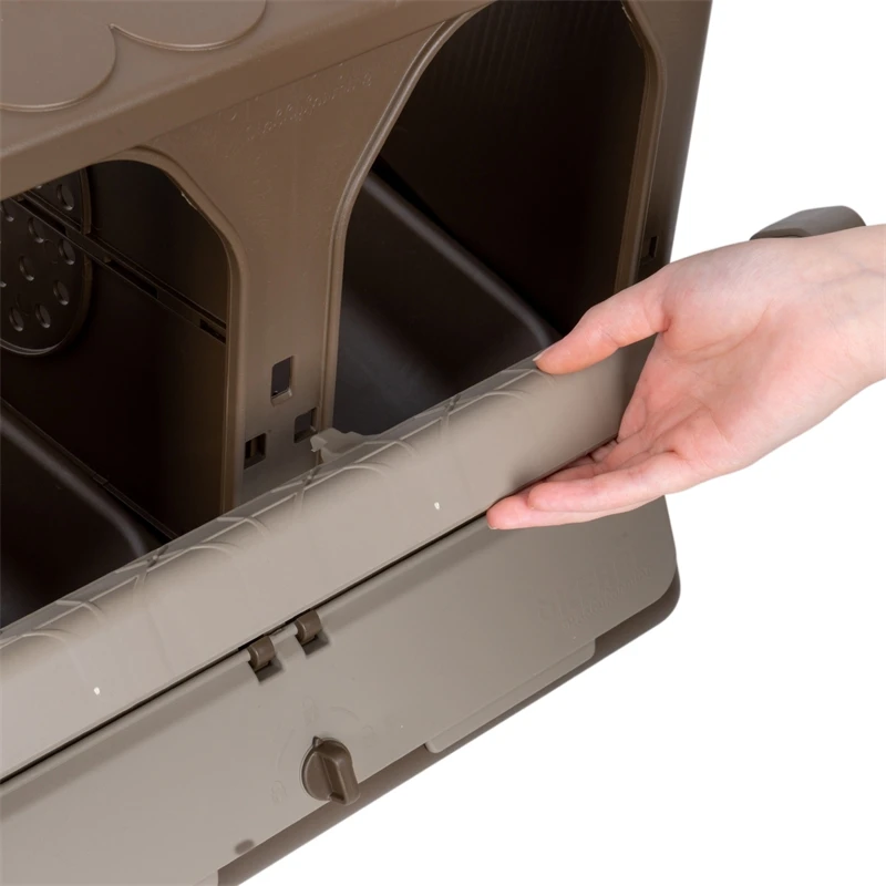 Praxistipp: Hühner sind gesellige Tiere und empfinden es als angenehm, sich in der Gruppe aufzuhalten. Dafür kann die modulare Trennwand herausgenommen werden, um ein gemütliches Gruppenlegenest zu realisieren. Die Stabilität wird durch die fehlende Trennwand nicht beeinträchtigt.