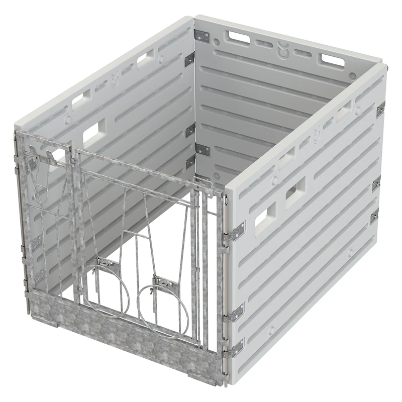 Die modulare Kälberbox bietet eine Stapellösung und bis zu 1,8m² Platz (1,60 x 1,15m) pro Box. Bis zu drei Boxen können zu einer Gruppenbucht kombiniert werden. Die robusten Kunststoffwände mit Versteifungssicken sind leicht zu reinigen und bieten durch die Sozialkontaktöffnung Kontakt zu anderen Kälbern. Das Frontelement verfügt über eine durchschwenkbare Drehtür und einen feststehenden Tränkebereich, gut geeignet zum Anlernen der Kälber an Nuckeltränken.