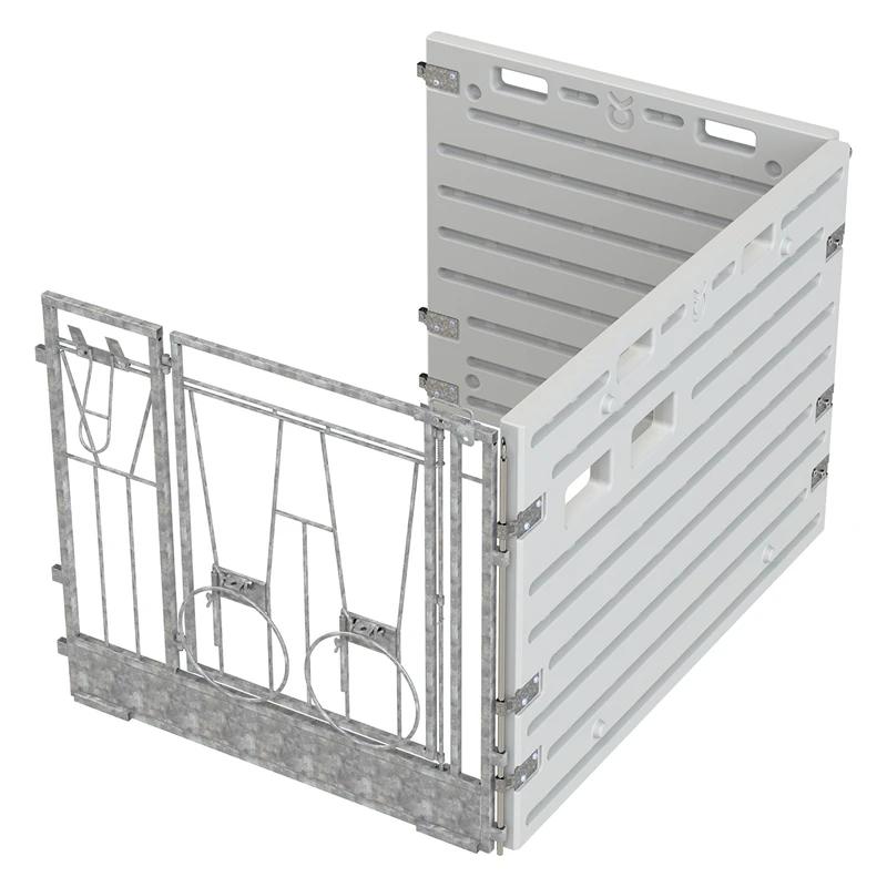 Die modulare Kälberbox bietet eine Stapellösung und bis zu 1,8m² Platz (1,60 x 1,15m) pro Box. Bis zu drei Boxen können zu einer Gruppenbucht kombiniert werden. Die robusten Kunststoffwände mit Versteifungssicken sind leicht zu reinigen und bieten durch die Sozialkontaktöffnung Kontakt zu anderen Kälbern. Das Frontelement verfügt über eine durchschwenkbare Drehtür und einen feststehenden Tränkebereich, gut geeignet zum Anlernen der Kälber an Nuckeltränken.