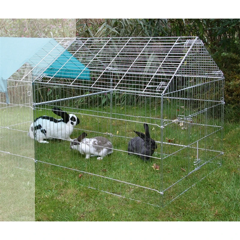 Das Gehege kann unter anderem auch für Hühner verwendet werden. Der Auslauf ist mit zwei Sitzstangen ausgestattet, die dem Gehege zusätzlich Stabilität verleihen. Um die Tiere vor der Sonne zu schützen, wird eine Abdeckung mitgeliefert, die den Tieren Schatten spendet. Die seitlichen Türen ermöglichen einen einfachen Zugang zu den Kaninchen und eine mühelose Anbindung an ein Freilaufgehege. Durch das Gitterdach sind die Tiere auch von oben vor Fressfeinden geschützt.