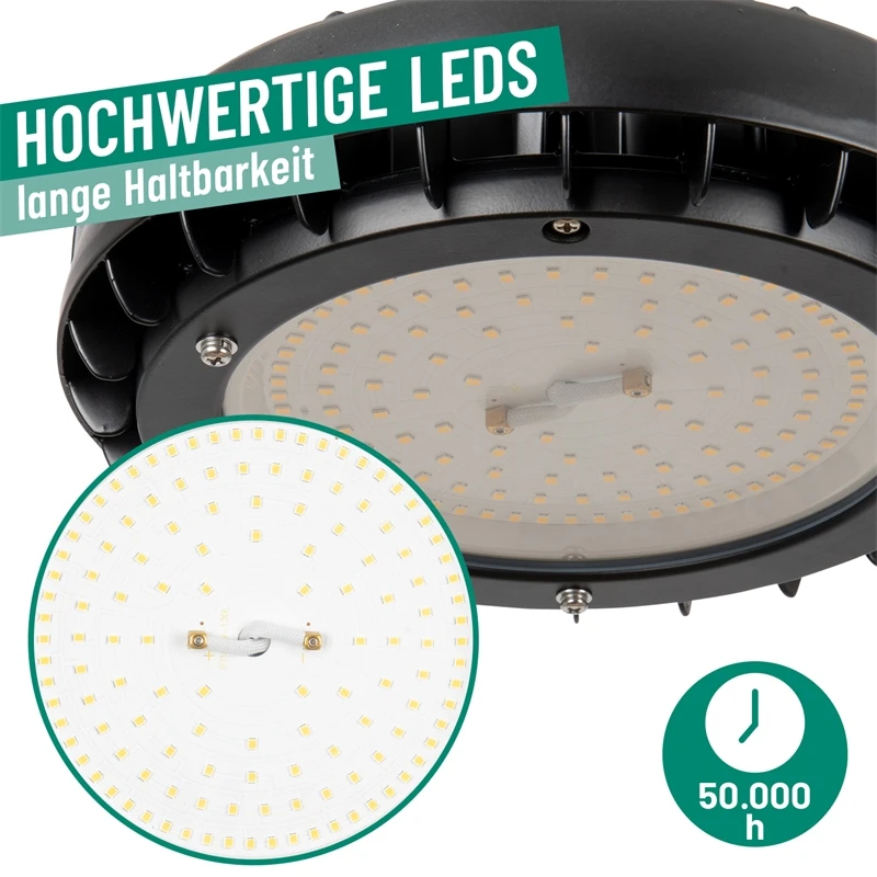 Der Strahler ist für hohe Deckenkonstruktionen geeignet und es ist sowohl eine direkte wie auch abgehängte Deckenmontage möglich. Bei dieser LED-Lampe haben Sie eine hohe Lichtausbeute und das neutral weiße Licht ermöglicht langes, angenehmes Sehen. Der Strahler ist flackerfrei und hat eine spezielle Kühlkörperform für eine optimierte Wärmeabführung. Zudem ist der Hallenstrahler staubdicht und strahlwassergeschützt, somit nimmt er keinen Schaden, wenn die jährliche Reinigung des Stalls mit dem Hochdruckreiniger vorgenommen wird.