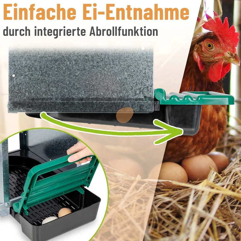 Auch für Sie als Hühnerbesitzer bietet das Legenest viele Vorteile. Dank einer Auffangwanne unter dem Kunststoffeinstieg können Sie die Eier schnell, einfach und vor allem sauber entnehmen.