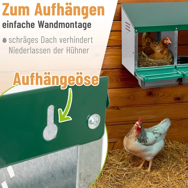 Das Legenest aus Metall kann an einer Wand montiert werden. Das Nest ist sehr leicht zu reinigen. Durch das schräge Dach wird verhindert, dass sich die Hühner darauf niederlassen, so sieht das Legenest auch von außen immer sauber und ordentlich aus.