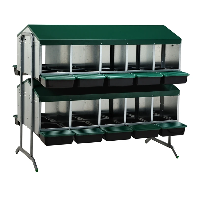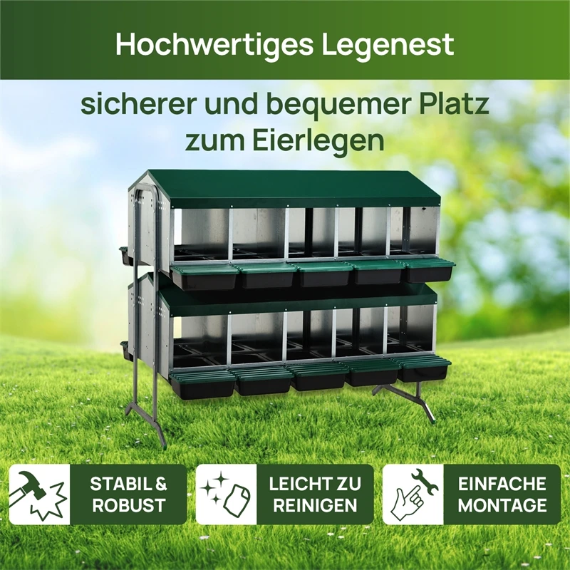 Das Legenest aus Metall kann schnell und einfach aufgebaut werden. Sie können es jederzeit einfach umstellen. Die Nester sind sehr leicht zu reinigen Durch das schräge Dach wird verhindert, dass sich die Hühner darauf niederlassen, so sehen die Nester auch von außen immer sauber und ordentlich aus. Die doppelseitige Montage der Nester ermöglicht ein platzsparendes Aufstellen – auch mitten im Hühnerstall.