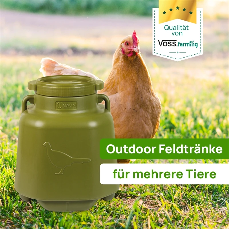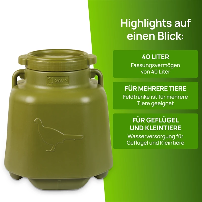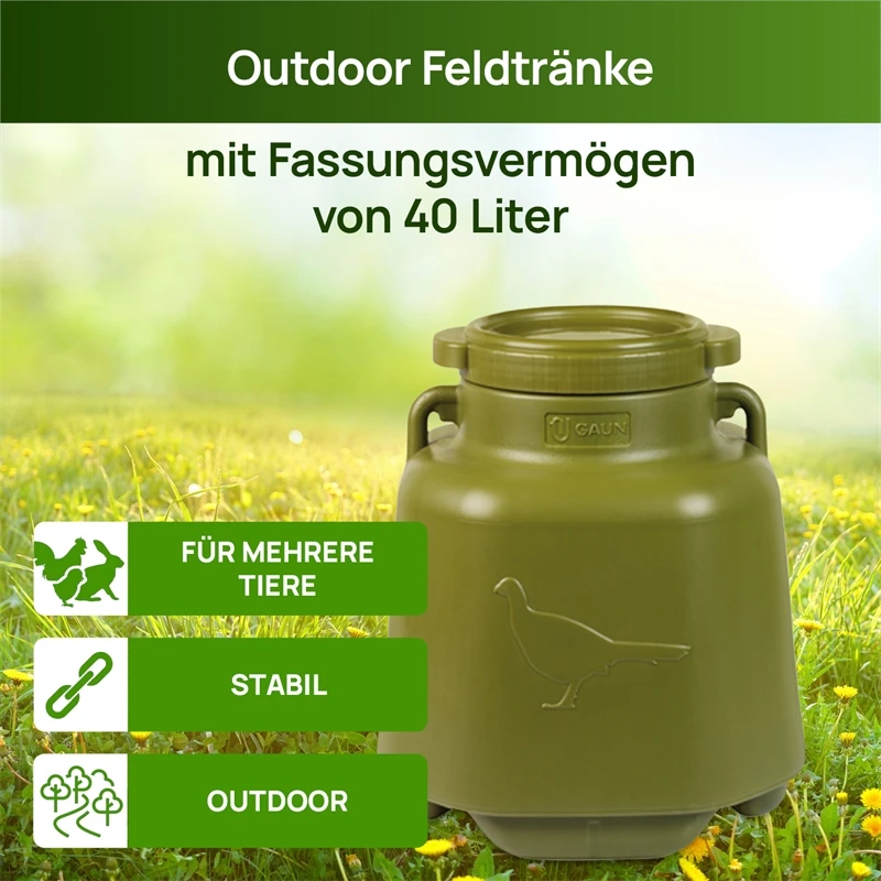 Die „Outdoor Feldtränke“ verfügt über ein Fassungsvermögen von 40 Litern und eignet sich für die Wasserversorgung von Hühnern, Rebhühnern, Fasanen sowie anderen Vögeln und Kleintieren. Die Tränke sollte erhöht positioniert werden, um eine einfache Zugänglichkeit für mehrere Tiere zu gewährleisten.