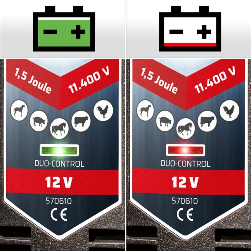 11.400 Volt Spannung und eine Schlagpower von 1,47 Joule sorgen für eine zuverlässige und sichere Einzäunung. Das Weidezaungerät ist mit einer gut sichtbaren DUO-LED – Batteriekontrollanzeige ausgestattet. Eine Funktions-LED zeigt an, ob das Gerät einwandfrei funktioniert. Das robuste, handliche Gehäuse ist sehr stabil, spritzwassergeschützt, sowie kratz- und stoßfest. Die Gerätemontage ist am Aufstellpfahl, der im Lieferumfang enthalten ist, an der Wand oder einem Pfahl möglich. Unser „Power XXL A1000“ hat einen geringen Stromverbrauch und ist zudem für Solarsysteme geeignet.