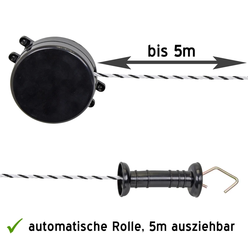Das Torsystem „Automatic Gate“ vereint viele Vorteile, sich in der Praxis seit Jahren großer Beliebtheit erfreuen. Es bietet eine hohe Sicherheit für die zu hütenden Tiere, da sich das Seil automatisch aufwickelt. Hierdurch wird verhindert, dass das Tier z.B. mit seinen Beinen an einem zu Boden gefallenen Torgriff hängen bleibt. Durch die Automatische Aufwicklung gibt weder ein Durchhängen des Seils noch ein Herumliegen oder Verschmutzen des Torgriffs am Boden. Hierdurch wird die Haltbarkeit des Materials erhöht. Zudem lässt sich das System einfach elektrifizieren, eignet sich aber auch ohne den Anschluß von Strom z.B. als flexibles Tor für Reitplätze, Paddocks, usw.