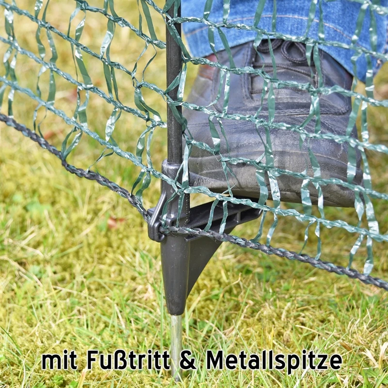 Für Kleintiere stellt der Universal-Begrenzungszaun eine einfache, mechanische Barriere dar. Möchten Sie Kleintiere allerdings dauerhaft zuverlässig mit einem grünen Netz hüten oder abwehren, empfehlen wir Ihnen unsere elektrifizierbaren Kleintiernetze.