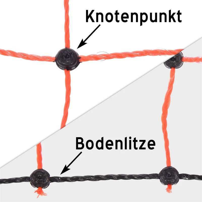 Das Netz hat eine Länge von 25 Metern, was die Einzäunung von kleinen Flächen oder kurzen Strecken schnell und einfach möglich macht. Aufgrund der geringen Länge muss das Netz für kleine Einzäunungen weder per Hand gekürzt noch teilweise aufgerollt werden – was sich negativ auf die Schlagkraft auswirken würde. Es ist mit oranger Litze ausgestattet, wodurch es auch gut sichtbar für Mensch und Tier ist. Die gute Sichtbarkeit sorgt zusätzlich für eine natürliche Abschreckung und erhöht somit die Hütesicherheit. Von den 12 waagerechten Kunststofflitzen sind 11 stromführend und mit 3x 0,2mm Edelstahlleitern versehen. Hierdurch erhalten Sie eine sehr gute Hütesicherheit. Die Bodenlitze ist schwarz und nicht stromführend. Für die sehr guten Hüteeigenschaften sorgt zusätzlich eine Kunststoffplombe an jedem Maschenkreuzpunkt, die dort für Mensch und Tier unlösbar verschweißt ist.