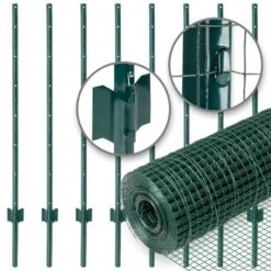 VOSS.farming Gartenzaun-SET: Volierendraht 10mx100cm, grün + 8x Metall Zaunpfosten
