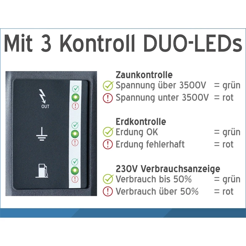 - drei Multi-LED-Anzeigen zur optischen Kontrolle über Zaunzustand, Erdung und Verbrauch