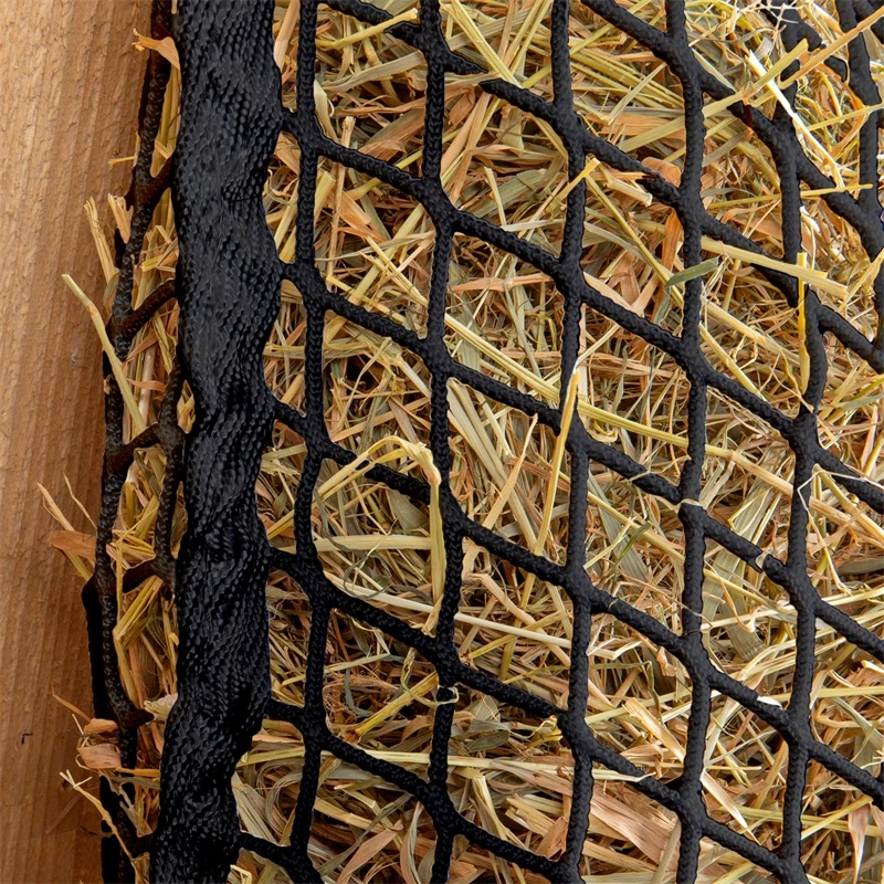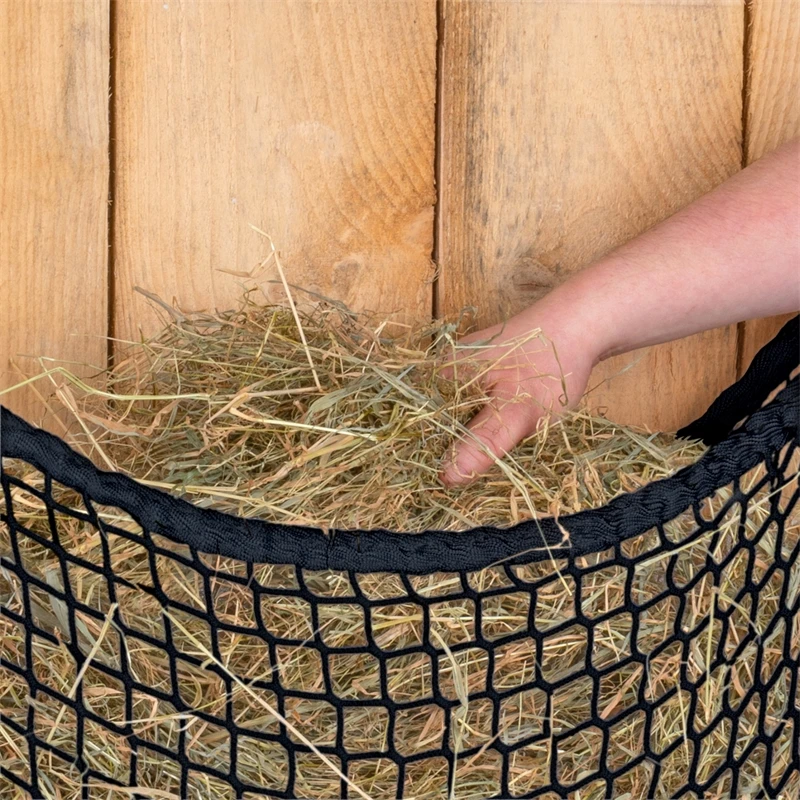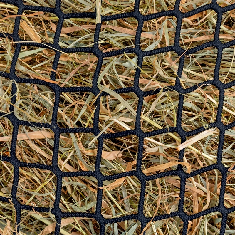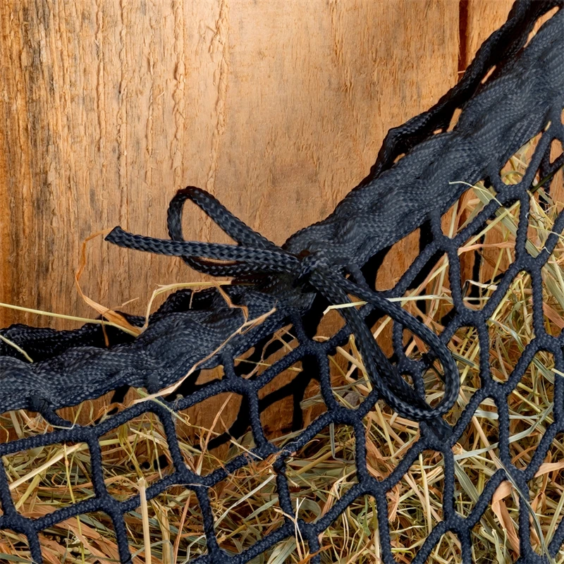 Dieses Heunetz eignet sich gut für die Nutzung in der Box oder auf der Weide. Es kann an allen vier Ecken sicher befestigt werden.