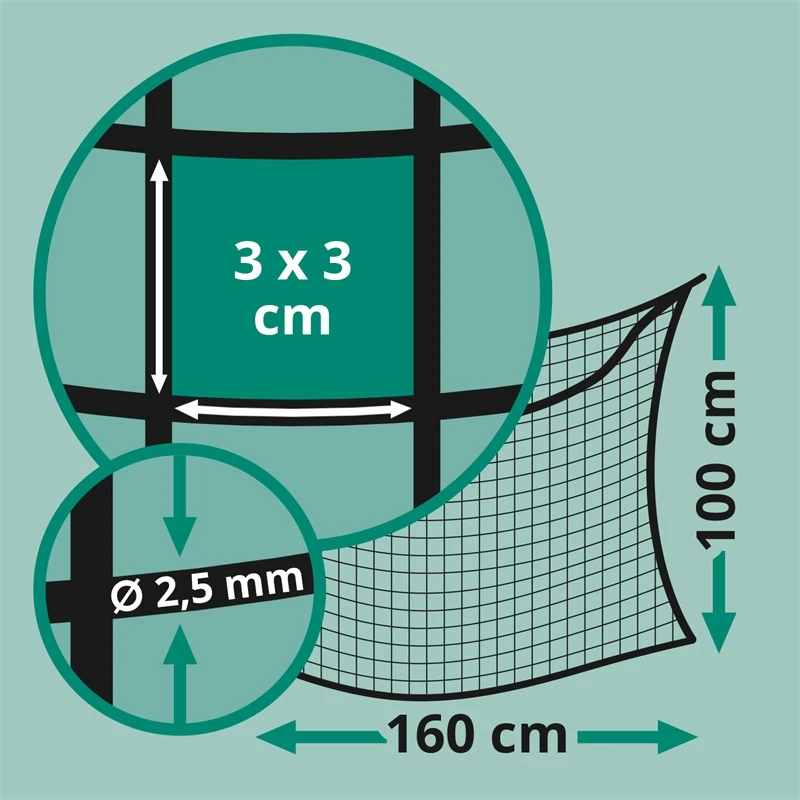 Das Netz sollte mindestens in einer Höhe von 120cm (Unterkante vom Boden) oder höher aufgehängt werden. Dadurch verringern Sie das Risiko, dass sich eines Ihrer Tiere im Netz verfängt.
