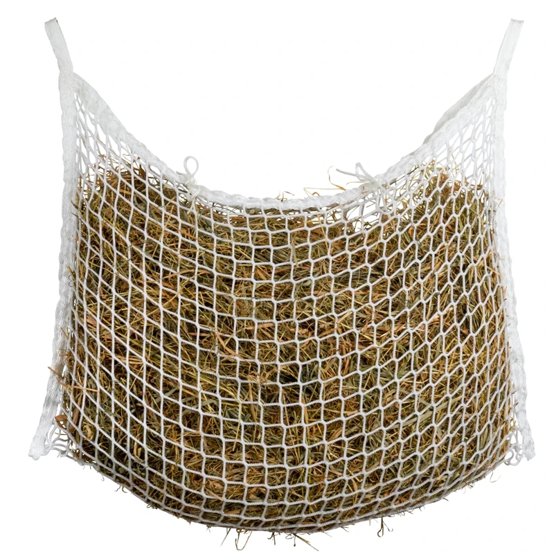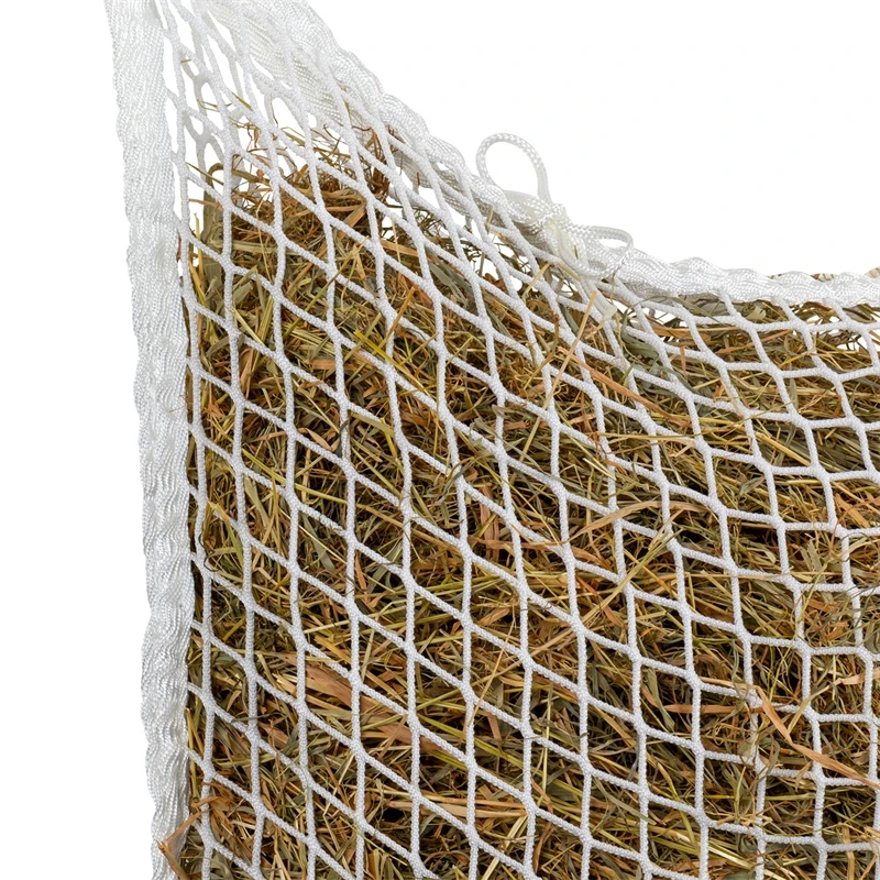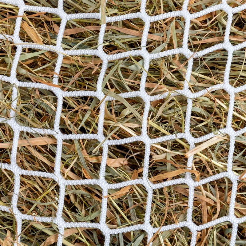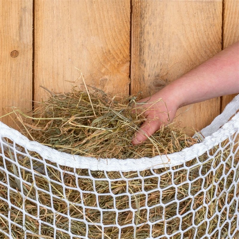 Dieses Heunetz eignet sich gut für die Nutzung in der Box oder auf der Weide. Es kann an allen vier Ecken sicher befestigt werden.