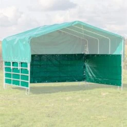 Das Set besteht aus einem Rückteil (3,95 x 1,30m) und zwei Seitenteilen (3,55 x 1,30m). Es eignet als Ersatz, sollte eine Plane kaputt gehen oder Sie Ihr bereits vorhandenes Weidezelt noch aufrüsten wollen, damit Ihre Tiere rundum geschützt sind vor schlechtem Wetter oder Insekten.