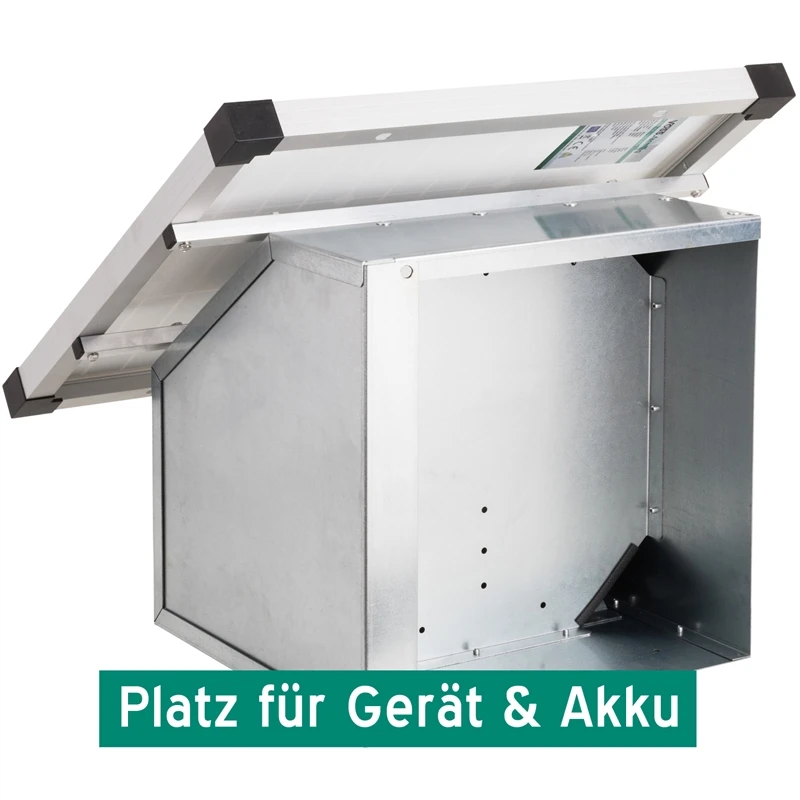 Der Tragekasten bietet ausreichend Platz für Weidezaungerät und Akku. Mit der Metall-Schiebetür kann die offene Seite des Kastens verschlossen werden. So erhöhen Sie den Schutz vor Witterungseinflüssen und Diebstahl.