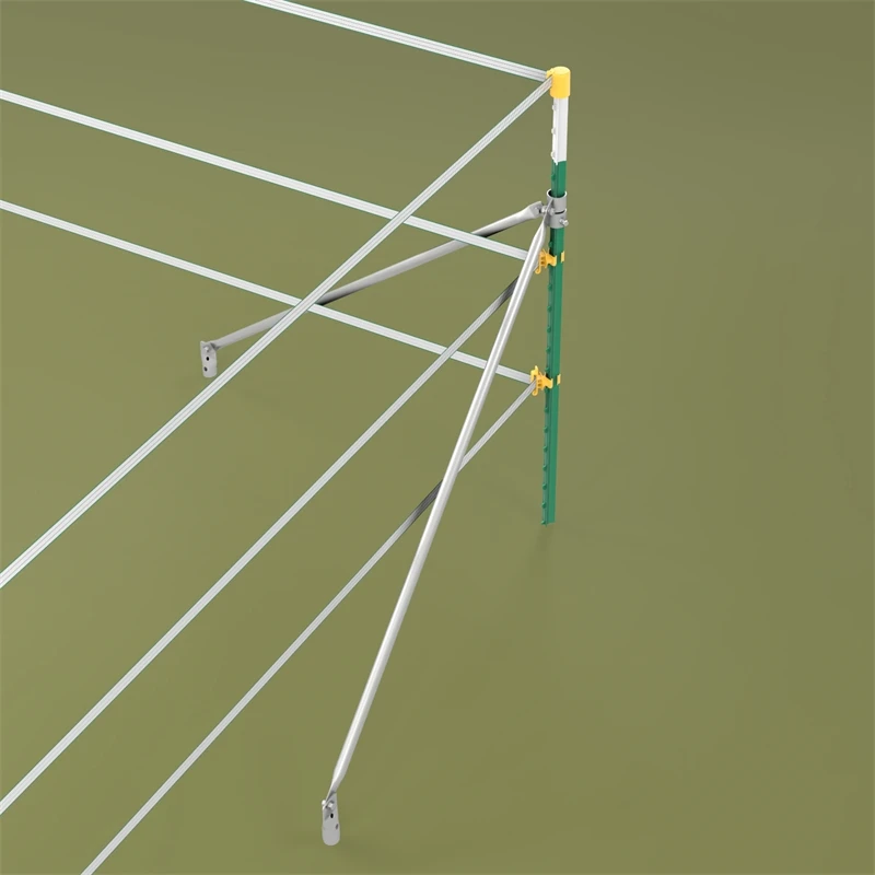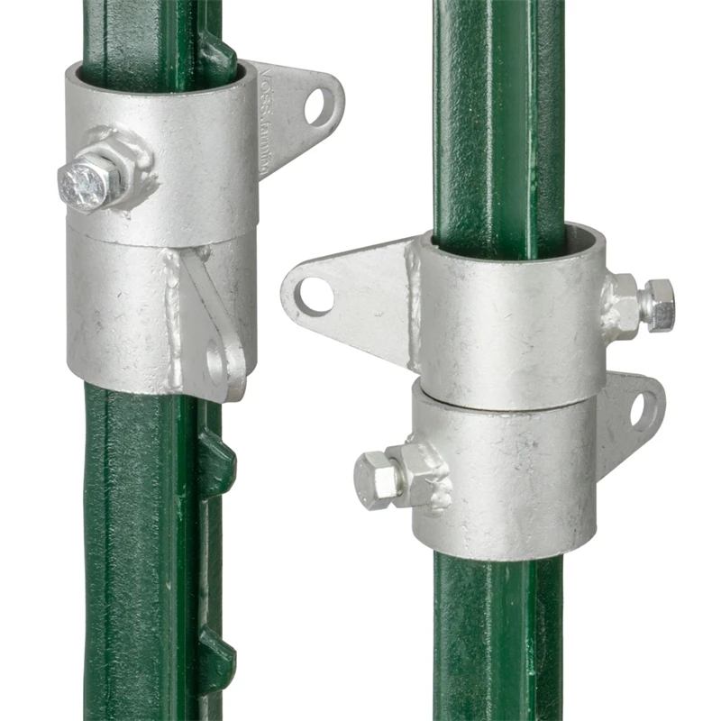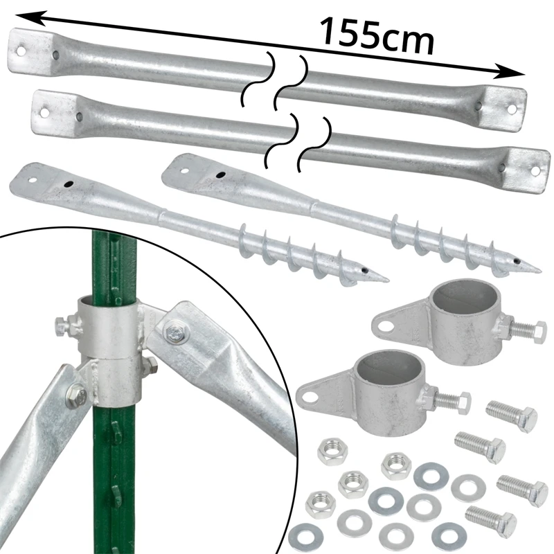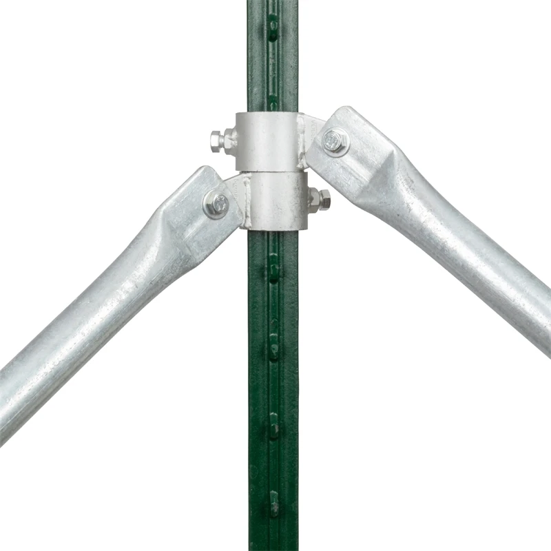 Besonders am Anfang, am Ende und in den Ecken sollte ein Festzaunsystem zusätzlich stabilisiert werden, um den hohen Zugkräften standzuhalten. Zur Stabilisierung der Zaunecken eines T-Post-Zaunes empfehlen wir Ihnen dieses Abstützset. Es besteht aus zwei Ringschellen, zwei Stützstreben und zwei Einschraub-Bodenankern. Sie benötigen keine extra T-Pfostenpfähle – Kostenersparnis!
