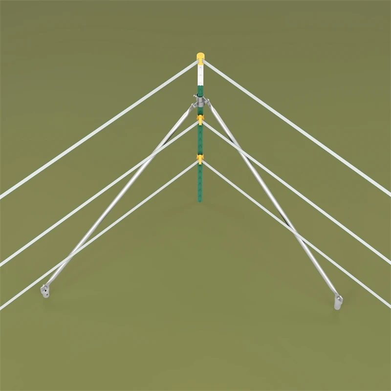 Die Ringschellen werden auf den T-Profilpfahl gesteckt, festgedreht und mit den Stützstreben verbunden. Im Anschluss werden die Erdanker in die Erde gedreht, dann werden die Stützstreben in die Aufnahmen der Bodenanker gesteckt. Durch ein Verschieben der Schellen können Sie den T-Pfosten ausrichten.