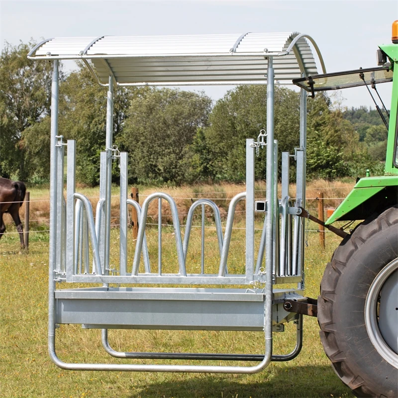 Diese praktische Futterraufe mit Dach und Palisadenfressgitter eignet sich zur Fütterung von Raufutter auf der Weide. Ob Pferde, Ponys oder Rinder – kein Tier frisst gerne schmutziges oder durchweichtes Raufutter. Legt man Raufutter direkt auf den Boden, dann passiert es leider oft, dass es schmutzig, nass und matschig wird. Die Tiere fressen dies natürlich nicht mehr, und Sie müssen diese Futterreste dann mühsam entsorgen. Mit unserer Heuraufe bleibt Ihnen nicht nur diese zeitaufwändige Arbeit erspart, Sie haben auch einen geringeren Futterverlust. Dank des Daches wird das Heu bei Regen nicht zu nass, somit besteht eine gute Futterqualität für bis zu 8 Tiere über einen längeren Zeitraum. Die Raufe kann schnell und einfach von zwei Seiten geöffnet werden und mit Rund- und Rechteckballen bis 1,4m Länge bzw. Durchmesser befüllt werden. Sie eignet sich für verschiedene Tierarten, da sie sich mit ihren höhenverstellbaren Kufen ganz leicht an die Tiergröße anpassen lässt. Sie verfügt zudem über eine stabile Dreipunktanhängung für einen einfachen und sicheren Transport. Der umlaufende Dachkantenschutz verringert die Verletzungsgefahr.