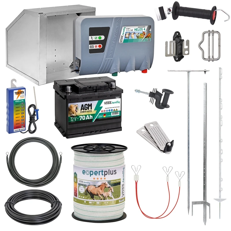 Das Pferdezaun-Spezial-Set umfasst das schlagstarke Weidezaungerät „HELOS 4“ von VOSS.farming: Es kann sowohl mit 12-V-Akku betrieben werden – wenn die Koppel zu weit vom Stromnetz entfernt ist – als auch über den 230-Volt-Stromanschluss. Den passenden VOSS.farming „12V AGM Akku 70Ah“ für Weidezaungeräte erhalten Sie im Set mit dazu. Passend zum „HELOS 4“ erhalten Sie die Weidezaunbox „Basic“ von VOSS.farming.