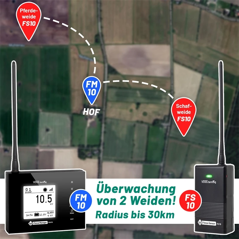 VOSS.farming „Weidezaun-Überwachung Komplettset“ – für 2 Zäune: Fence Manager FM 10 + 2x Fence Sensor FS 10
