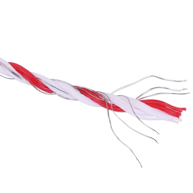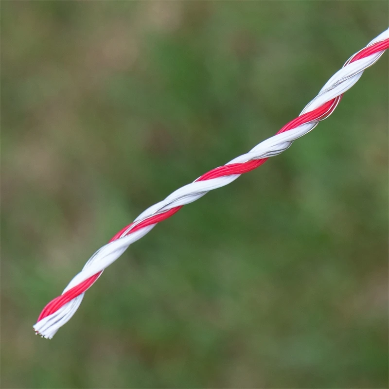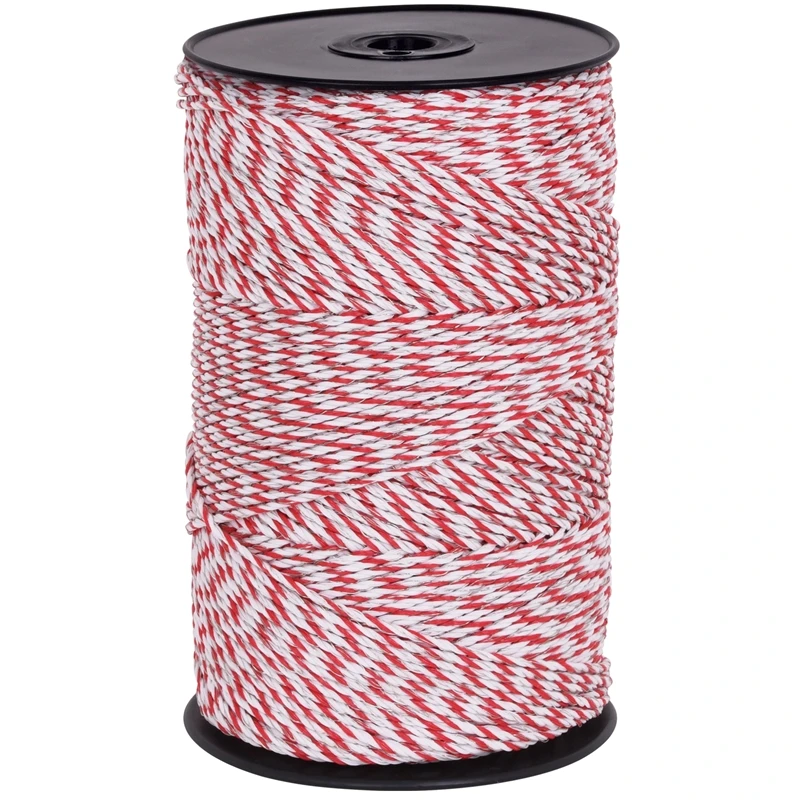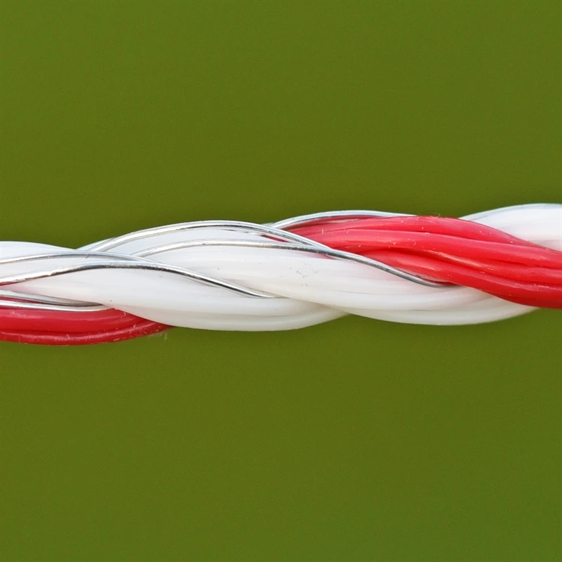 Die weiß-rote Weidezaunlitze von VOSS.farming eignet sich für lange und schwierige Einzäunungen. Die dicken PE-Fäden mit 3 Edelstahl- und 3 Kupfer-Leitern sorgen für eine hohe Leitfähigkeit. Dadurch ist die Litze auch sehr gut zur Wildabwehr geeignet. Die Leiterbündel – jeweils ein Edelstahlleiter und ein Kupferleiter – sorgen für eine konstant hohe Hütespannung in der Zaunanlage.