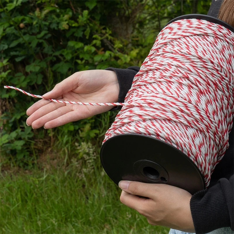 Durch ihre weiß-rote Farbe ist diese Weidezaunlitze für Tiere gut sichtbar und bietet somit zusätzlichen Hüteschutz.