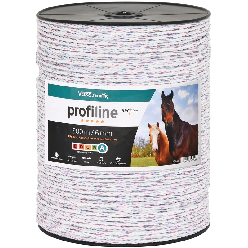 VOSS.farming Weidezaunseil 500m, Ø 6mm, 6×0,25 HPC Powerleiter, XL-Rolle, Pferdezaun, weiß