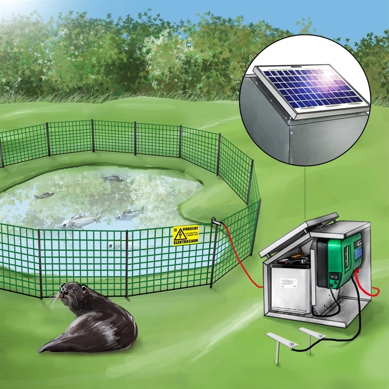 Unerwünschter Besuch von Fischottern, aber auch anderen Tieren wie Reihern, Katzen, Mardern u. a. wird zuverlässig verhindert. Da Fischotter Hindernisse meist nicht untergraben, sondern überklettern, ist ein Elektronetz ein sinnvoller und preisgünstiger Schutz für Ihren Fischbestand.