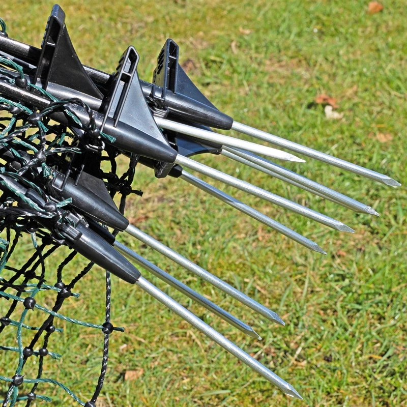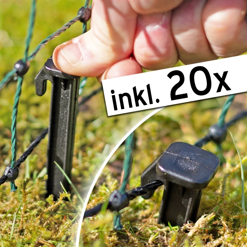 Die stabilen schwarzen Standpfähle sind nicht nur robust, sondern sorgen für einen sicheren Stand, auch bei weichem Boden. Der Pfahl ist mit einer Spitze ausgestattet, die mit Widerhaken in diesem verankert ist. Die Pfähle können einfach mit dem Fuß in den Boden getreten werden. Dank des geringen Pfahlabstands wird ein Durchhängen des Netzes verhindert. Zum Elektrozaunnetz erhalten Sie 20 Heringe gratis.