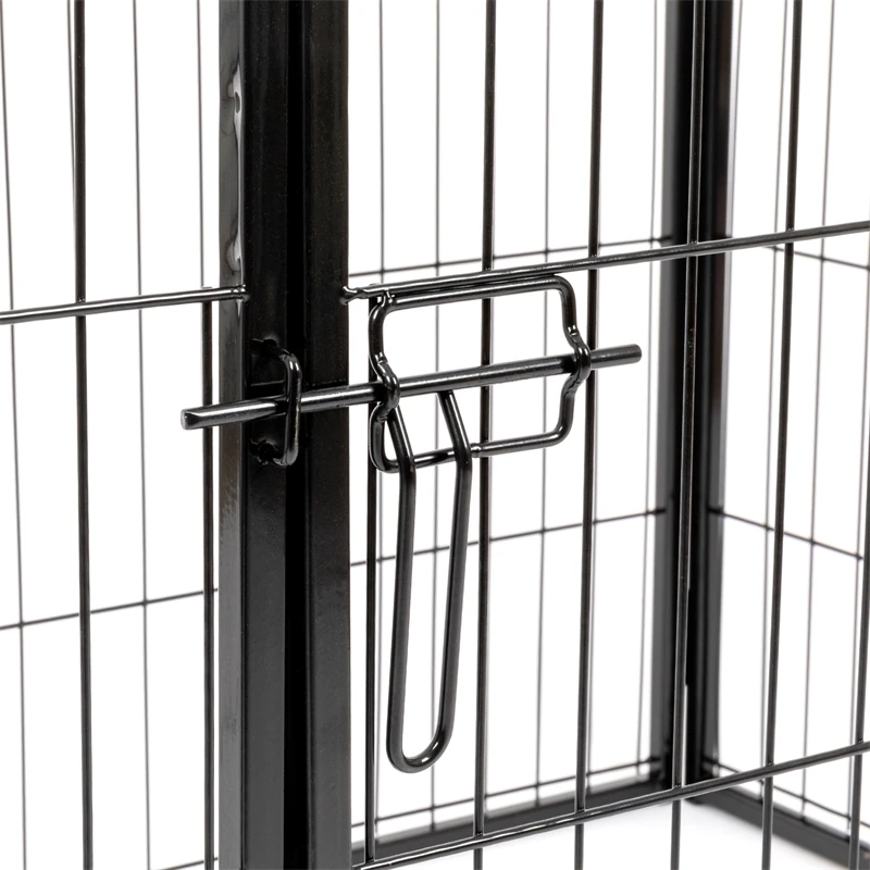 Der Welpenzaun lässt sich einfach und ohne Werkzeug errichten. Die einzelnen Elemente werden über die angeschweißten Scharniere miteinander verbunden.